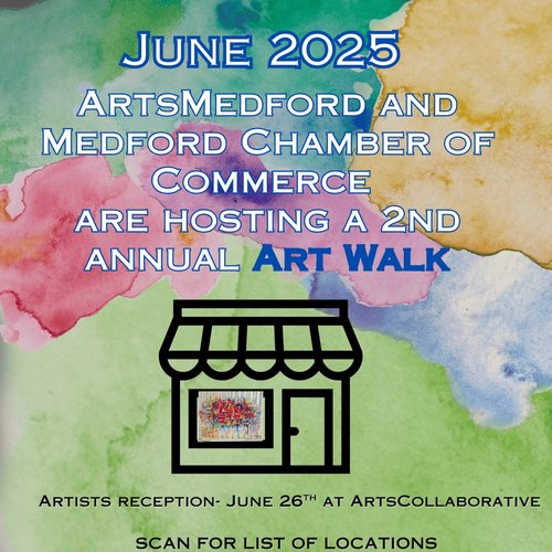 Join us to commemorate the 2nd Annual Art Walk hosted by Arts Medford and Medford Chamber of Commerce. It has been a month of seeing local businesses feature the beautiful work of local talent in their windows. Come to mingle, meet artists and business owners – it will be a good time for all! All ages. Light refreshments provided.