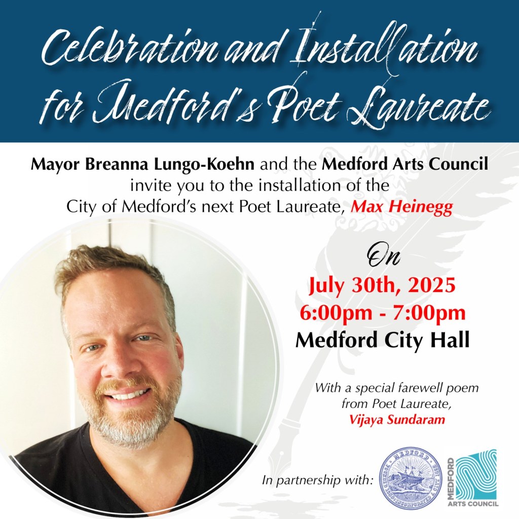 “We are thrilled to announce Max Heinegg as Medford’s Poet Laureate for the next two years,” said Mayor Lungo-Koehn. “His experience in our community, especially our schools, coupled with his dedication to his craft made him an ideal candidate to build upon Vijaya Sundaram and Terry Carter’s work.”