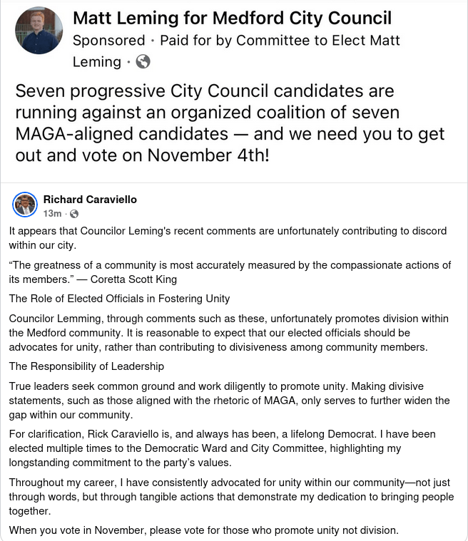Below is the surprising post by councilor Leming. Surprising because the independent candidates have not engaged in false statements or about aligning with any particular group. They have spent their entire time discussing solutions to Medford’s problems. The independent candidates are looking to unite Medford not cause dissension through false claims. Councilor Leming please do better. Medford deserves actual solutions to issues. Councilor Leming may have forgotten that city elections are not partisan elections. There is no Democrat vs Republican at the city level and by making such a claim is not only misleading but dangerous. We’re all in this to help Medford, councilor Leming may have forgotten that.