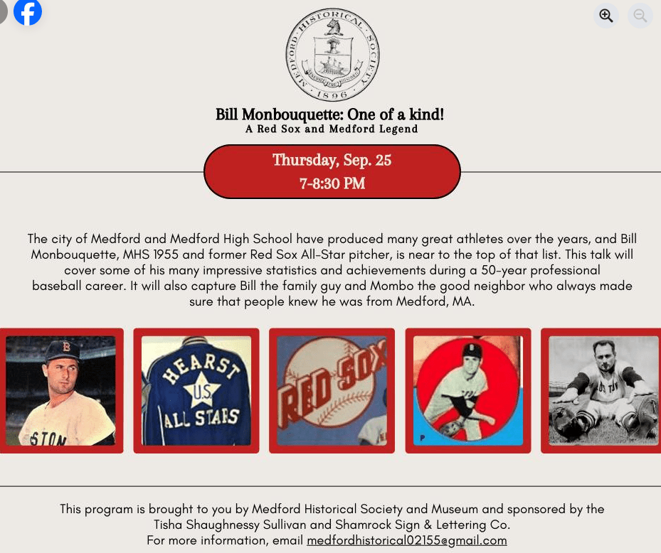 This has been a busy week for the Medford Public Library and this coming week is no different. On Thursday come hear about Medford’s own Bill Monbouquette as his career with the Red Sox is examined and his life as a Medford resident!