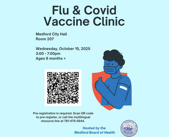 The Medford Board of Health is hosting a flu and COVID vaccine clinic on Wednesday, October 15 from 3-7pm at Medford City Hall – Room 207.