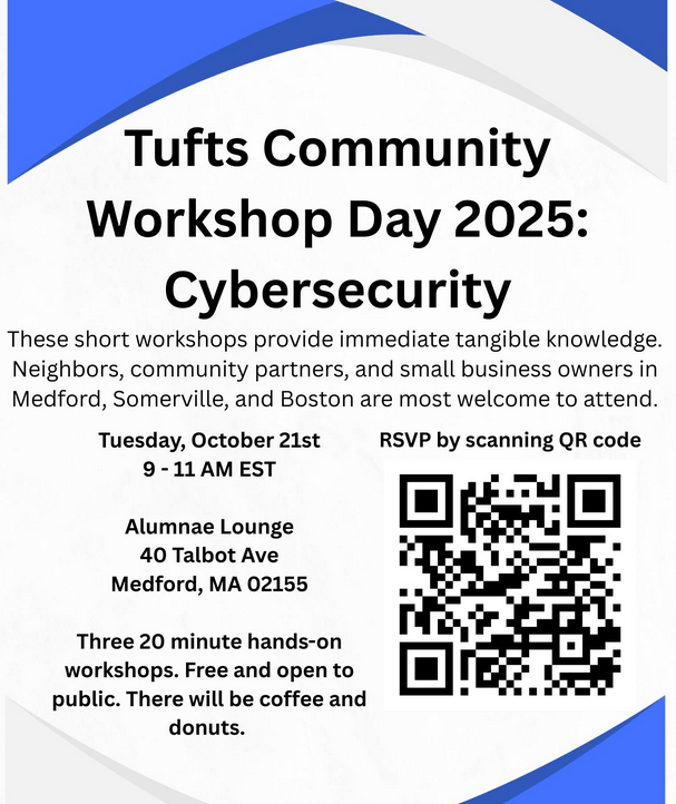 Tufts invites the local community to their 2025 Workshop Day on cybersecurity. On Tuesday, October 21 from 9am-11am at the Alumnae Lounge, join the 2-hour workshop day on cybersecurity where people can learn from Tufts University faculty, students, community, and industry leaders in short sessions.
