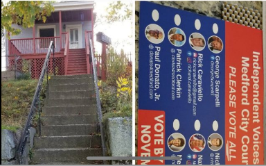 The reason why I have these two pictures together is about that very theme. The current Medford elections are crucial at this period of time. I have been canvassing with my friend, Judy, for the Independent Candidates. The house which you see is in my neighborhood. I’m eighty-one years old. The task of climbing those stairs seemed insurmountable to me. I started taking the steps thinking of the group goals: zoning that protects neighborhoods, infrastructure concerns, police, fire, teachers, DPW concerns, Medford High School, local issues with public input.