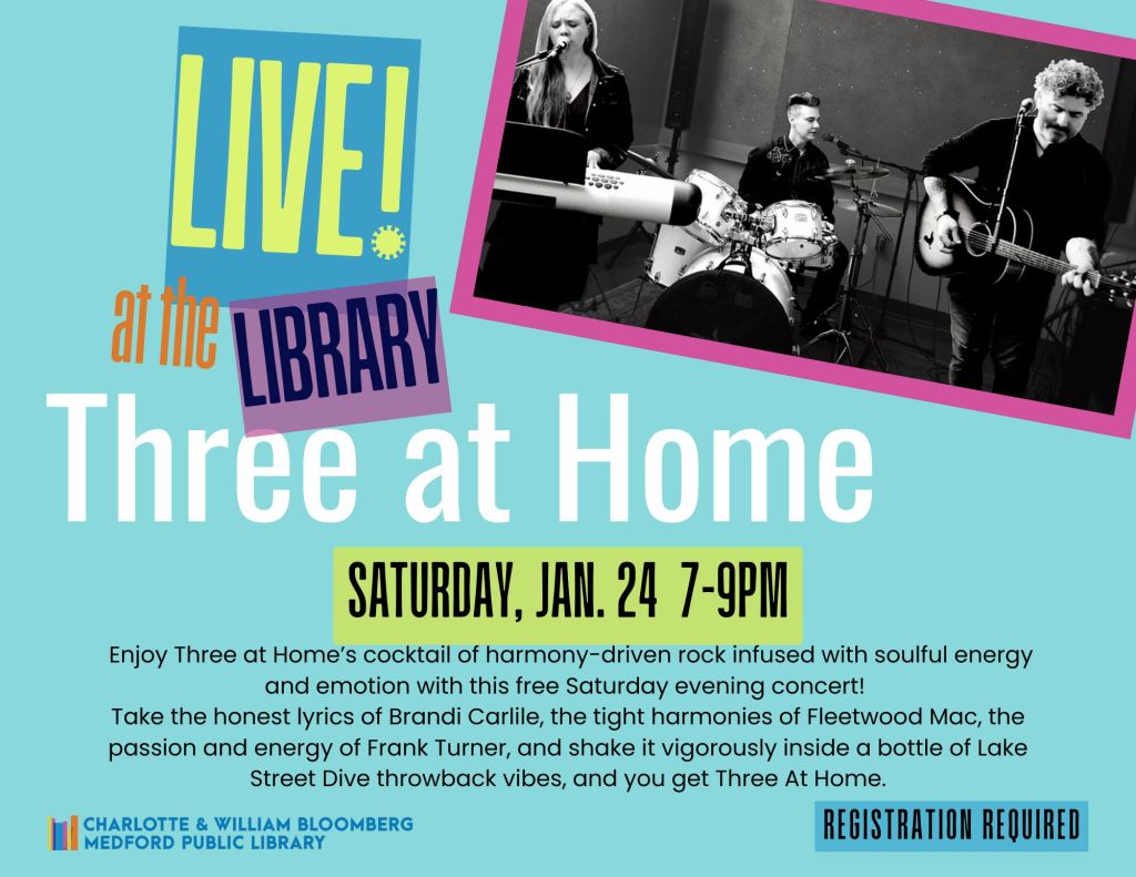 There will be a concert this Saturday, Jan. 24th from 7-9 pm in the beautiful Bonsignore Hall at the Library featuring local band Three At Home. The show is free but please register here if you plan to come.
